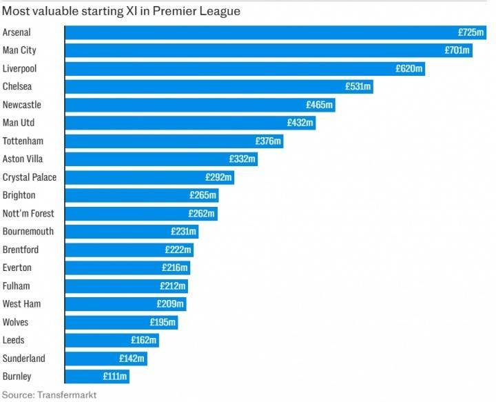 考虑到今夏的支出——转会窗尚未关闭——阿尔特塔在阿森纳的总花费已达8.6亿英镑。从价值上看,这并非浪费金钱。阿森纳招募得很好。这是一支优秀的阵容,转会市场也评估他们拥有英超最有价值的首发十一人。